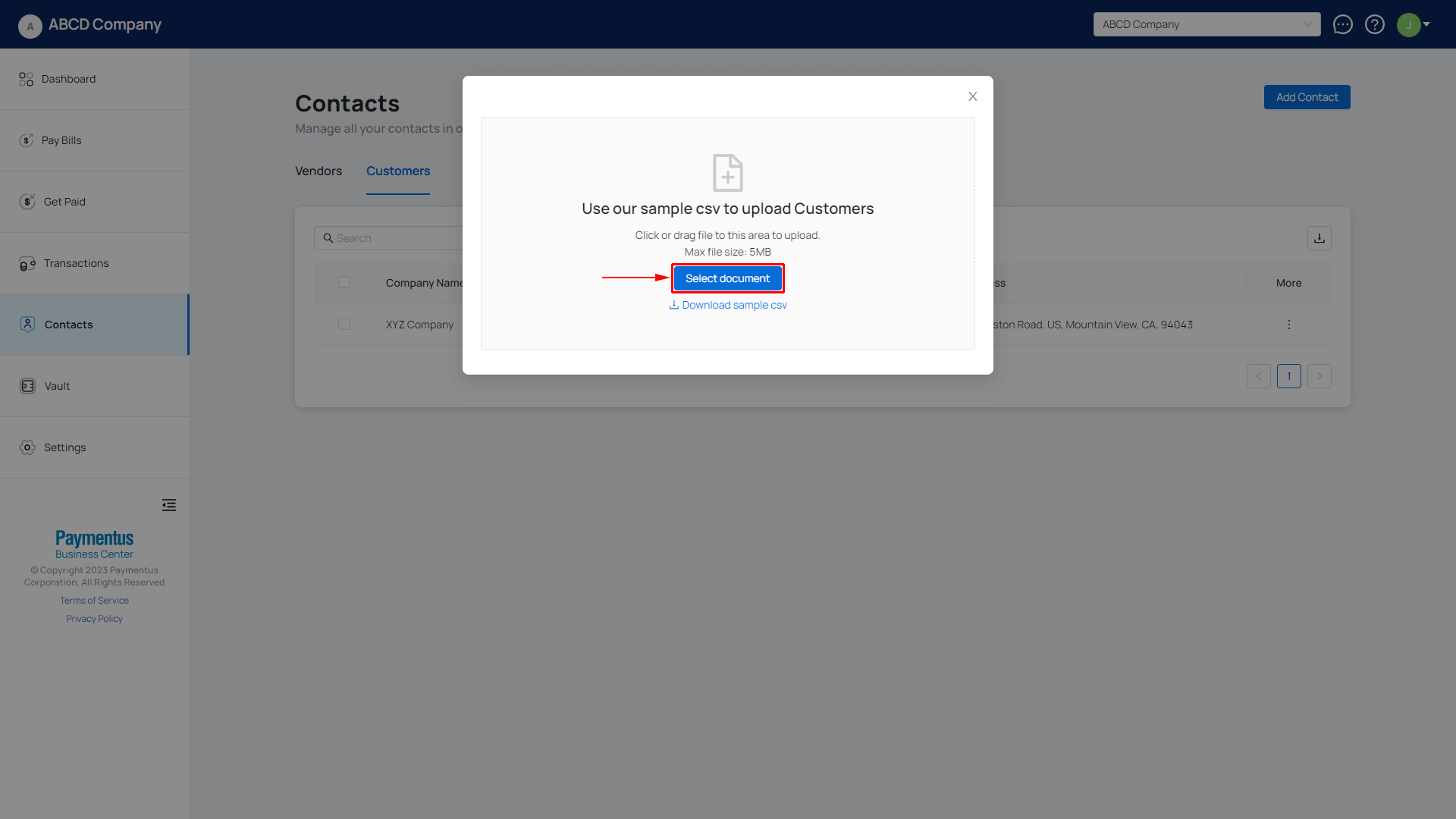 - Click on Select document and find the CSV file to upload. If you require our CSV template, click on Download sample csv.