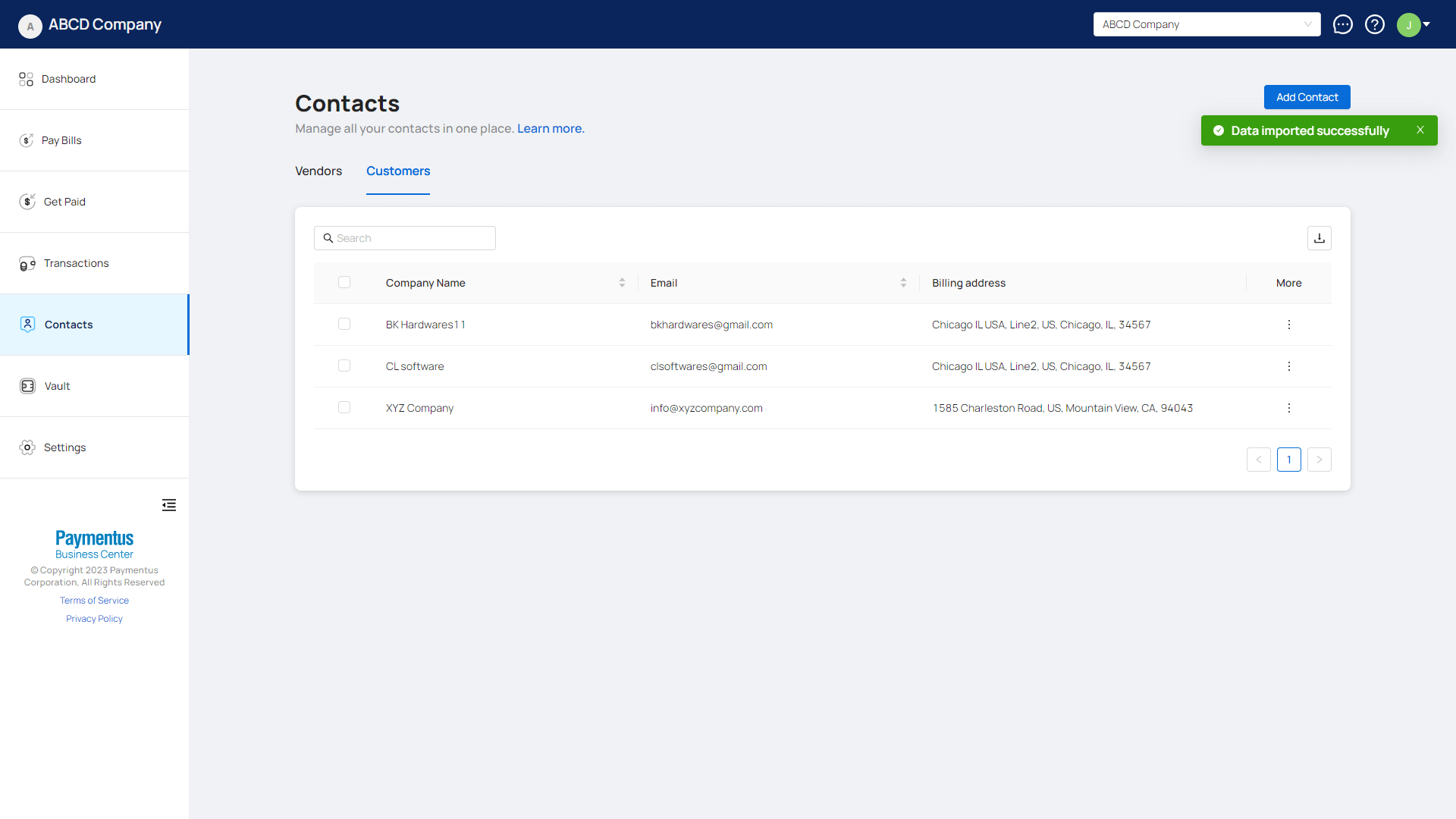 - If the file imports successfully, you'll get a success toast message and see your customer(s) populated in the table.