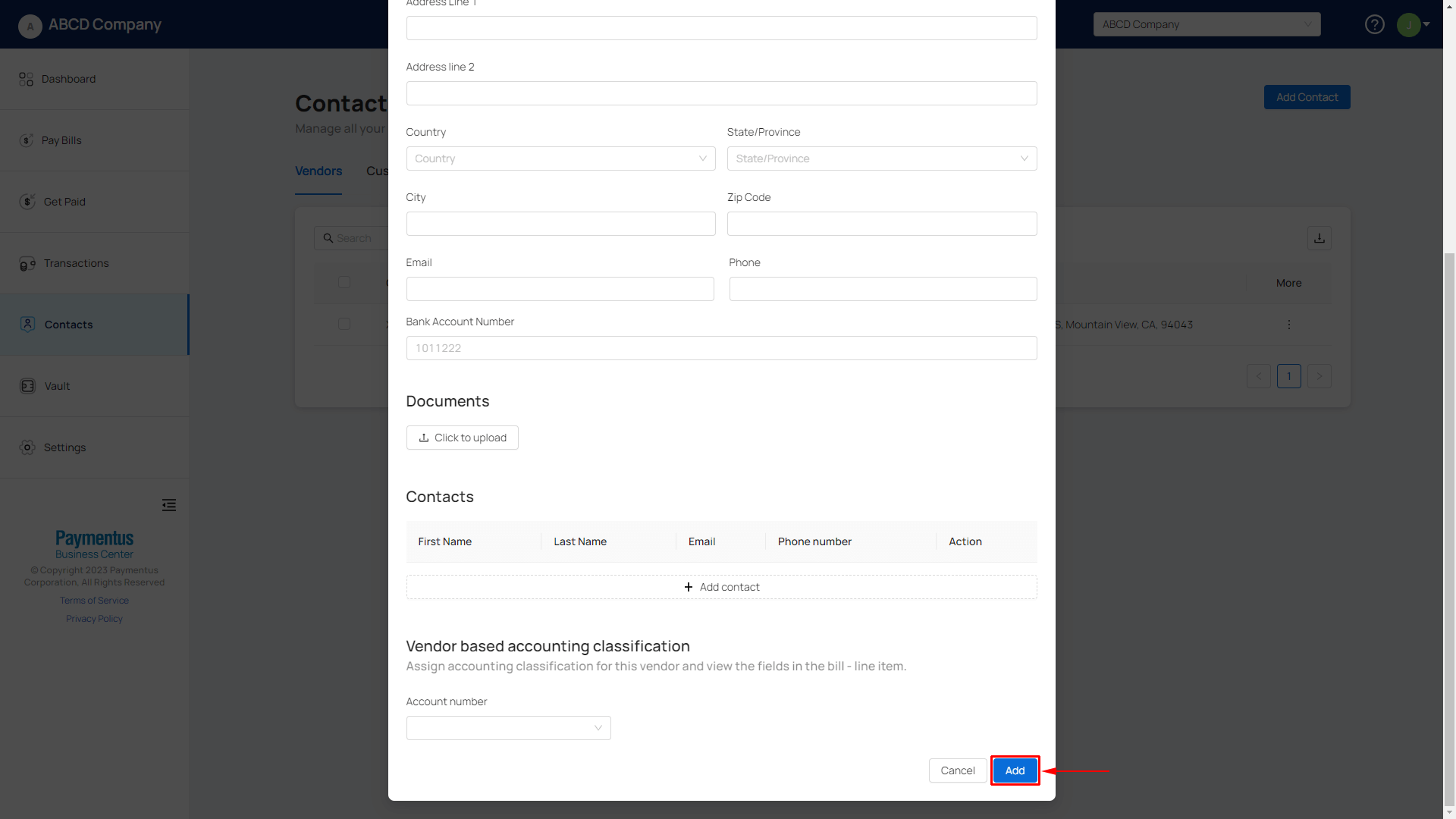 - Navigate to Contacts, click on Add Contact.