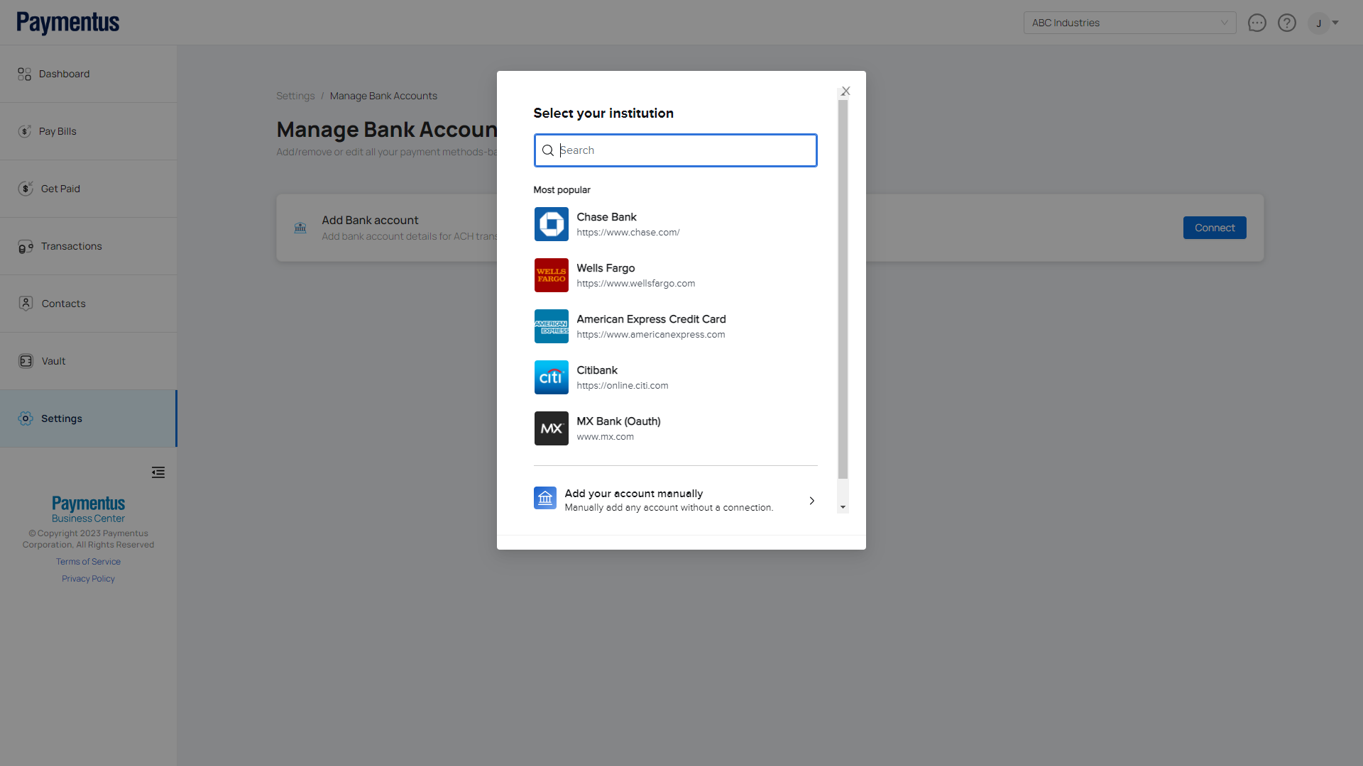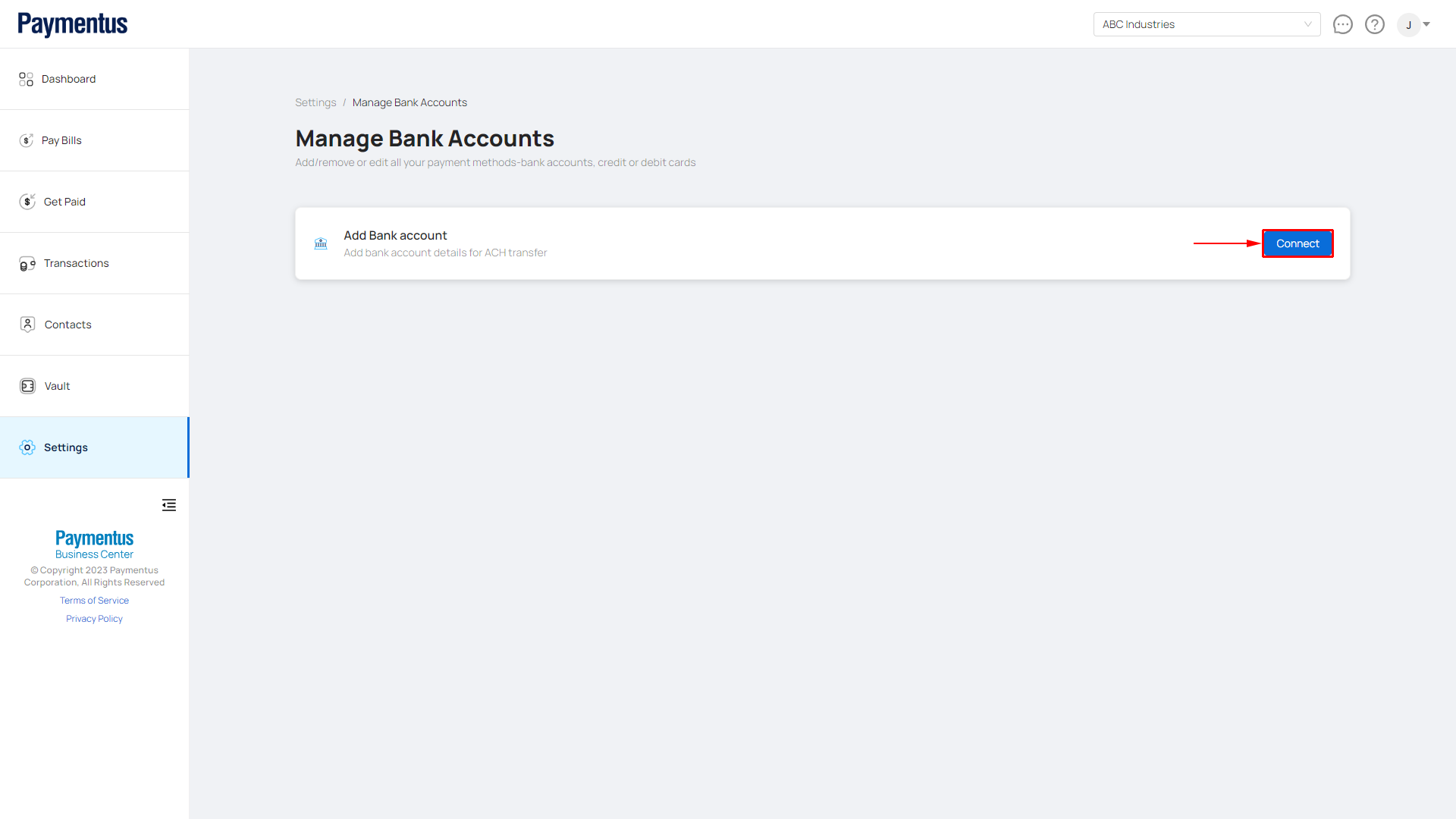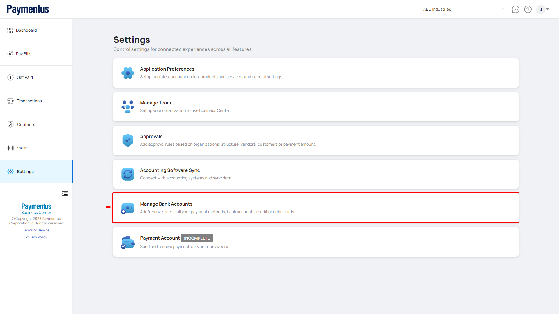 - Click on Manage Bank Accounts.