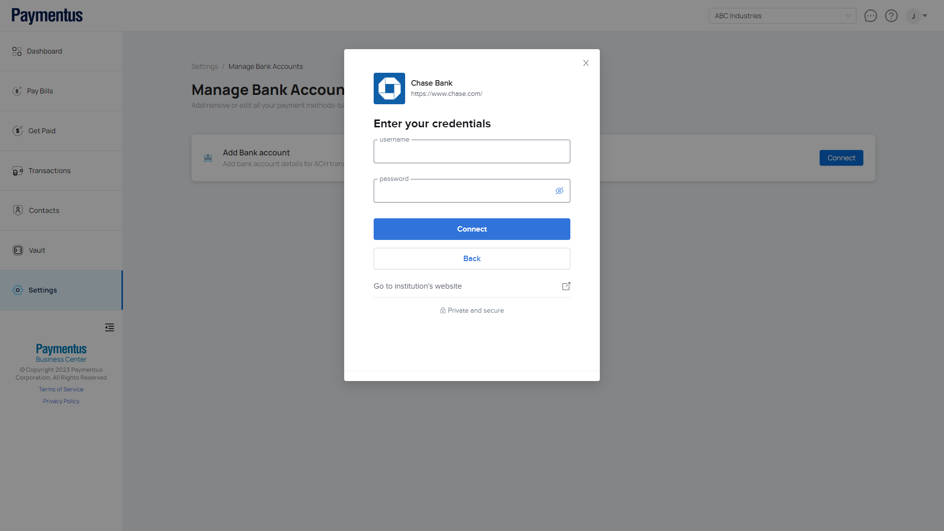 - Provide your online banking credentials and click Connect.