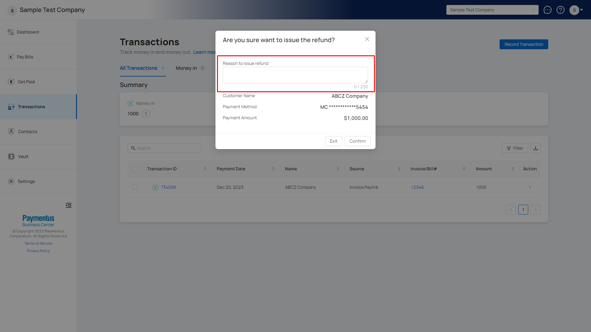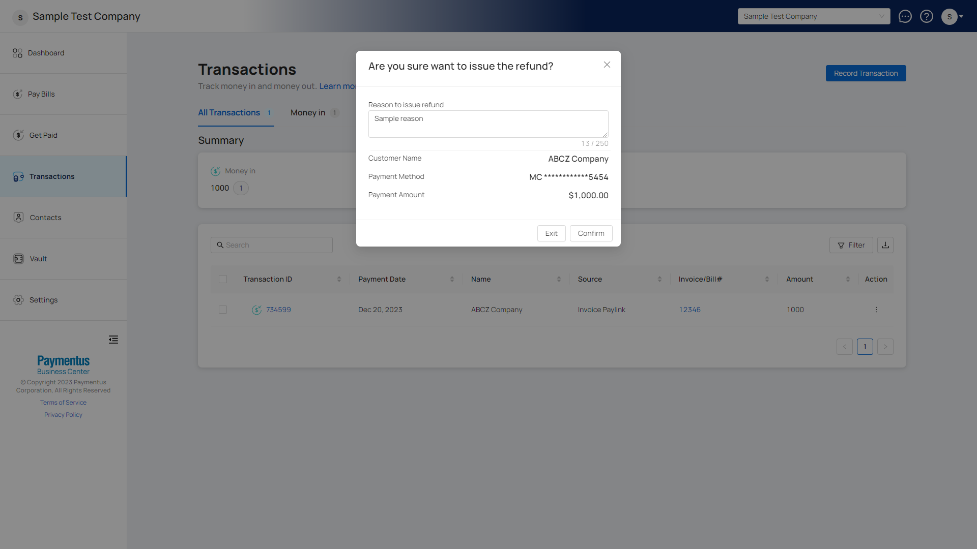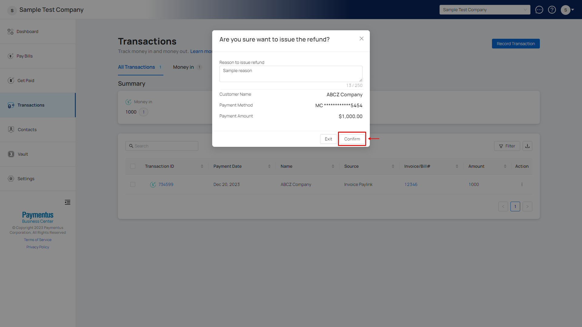 - Click Confirm to complete the refund process.